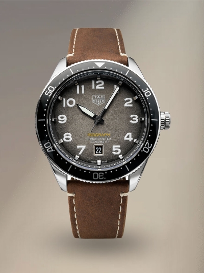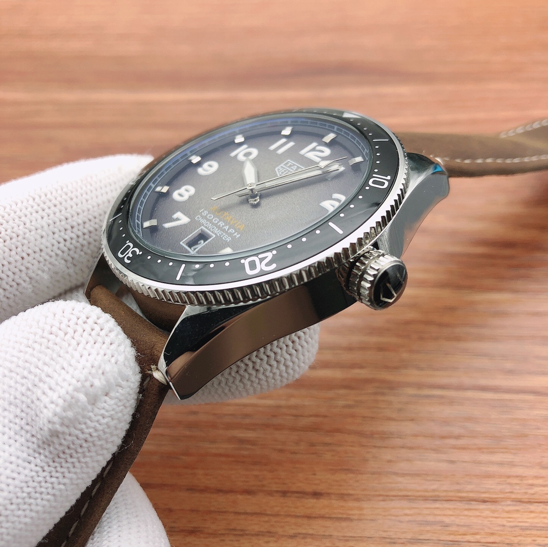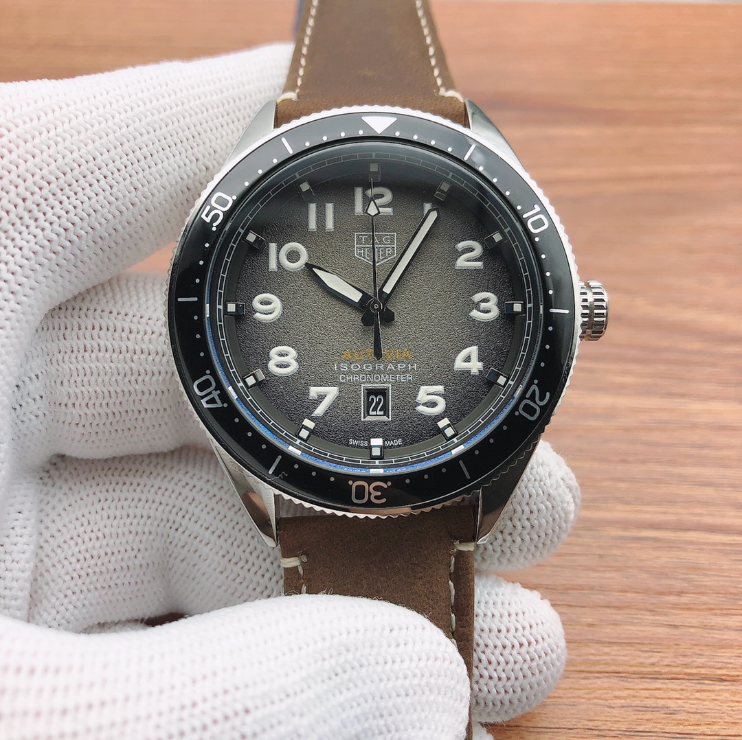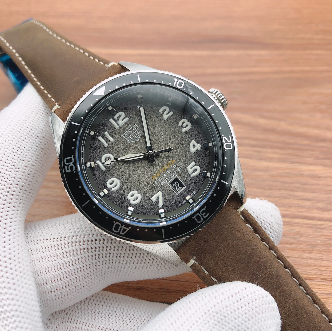 Find the most outstanding vintage-style watch with our Best Swiss Replica Tag Heuer Autavia Automatic Grey Dial Watch (Ref: WBE5114.FC8266). This highly precise super clone watch boasts a beautiful gradient effect on the smoked grey-to-brown face with luminous Arabic numeral hour markers and a Super-LumiNova coating on the sword-shaped hour and minute hands for optimal visibility in the dark. The 42mm case is made of high-grade 904L stainless steel with a brushed finish and a bidirectional rotating ceramic bezel, along with a domed sapphire crystal for a luxurious vintage-style pilot watch look.
