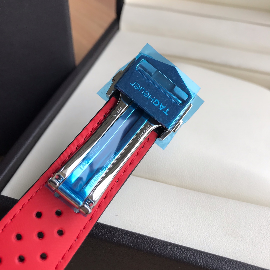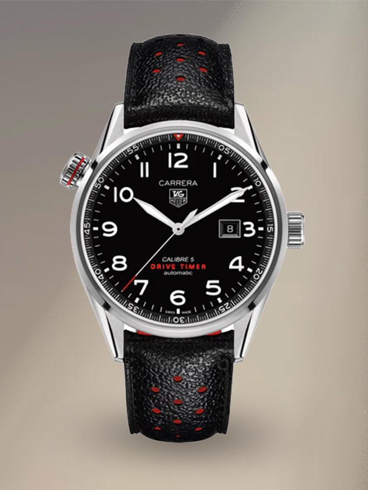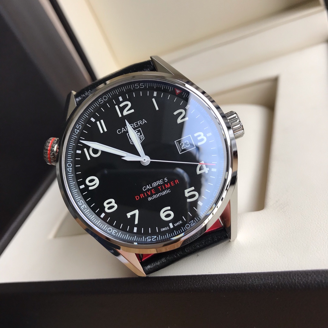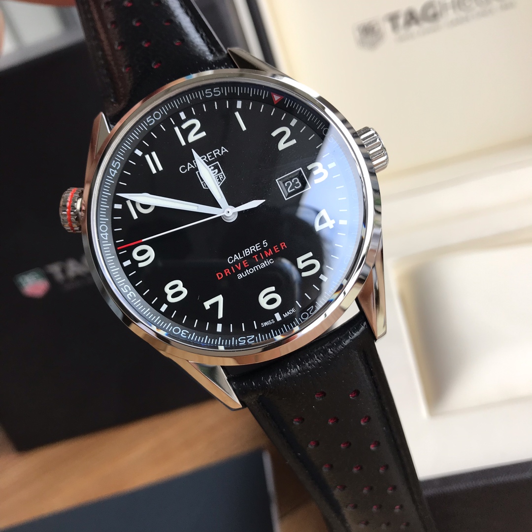 The replica TAG Heuer Carrera WAR2A10.FC6337 is all about sharp style and solid quality. It’s got a 43mm stainless steel case and a clean black dial that keeps things classic but bold. Crafted from black leather with a bold red underside, the strap adds a perfect blend of sportiness and luxury that catches the eye.