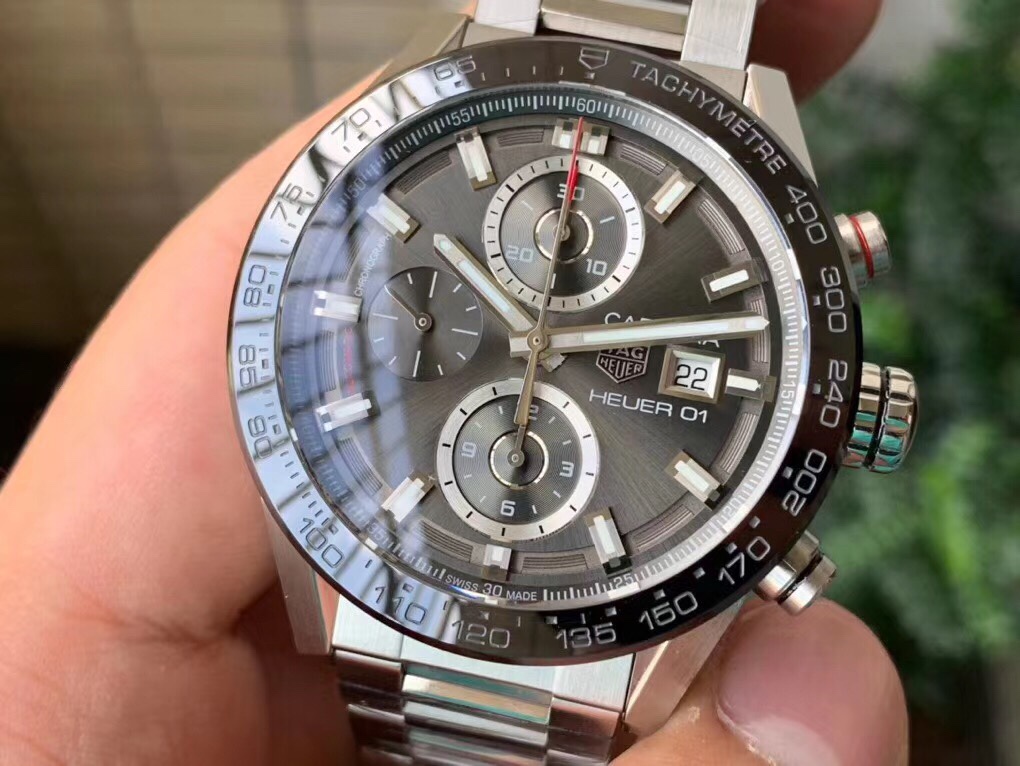 Learn more about the bold and exciting TAG Heuer Carrera Calibre Heuer 01 Automatic Chronograph Replica. The latest innovation in TAG Heuer’s line of contemporary motor sports chronographs is equipped with an advanced charcoal grey sunburst dial with rich depth and dynamics as it transitions from light to dark metallic colors with different lighting conditions. The dial is further equipped with a date display at 3 o'clock and three sub-dial displays for precise chronograph timekeeping.