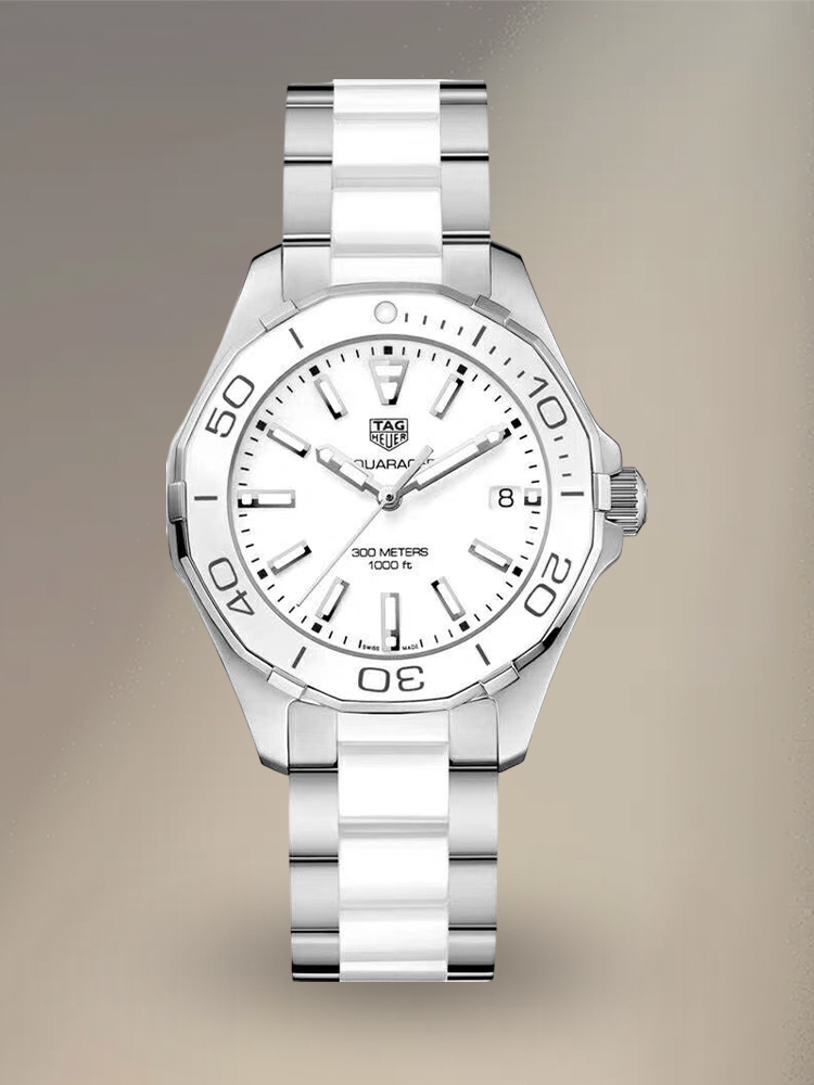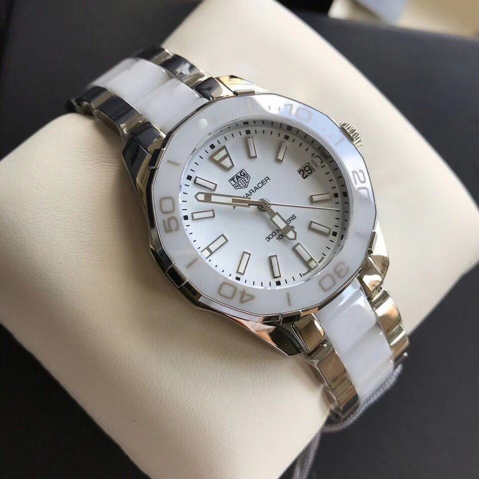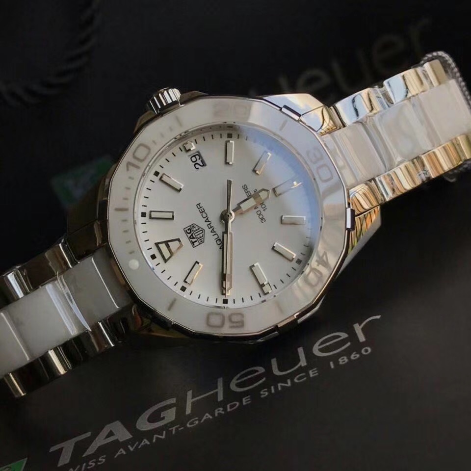 Replica Tag Heuer Aquaracer WAY131B.BA0914 is a ladies' watch that understands style and practicality. White ceramic bezel 35mm stainless steel case watch. It's classic in looks. It comes with a white face, which is accentuated by silver-tone hands and indices, making it very legible. A date window at 3 o’clock adds everyday convenience.