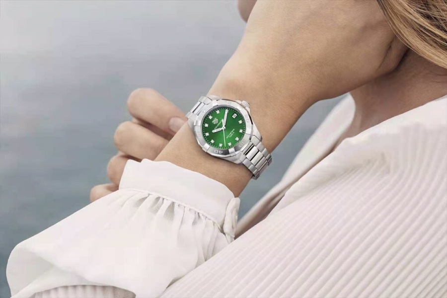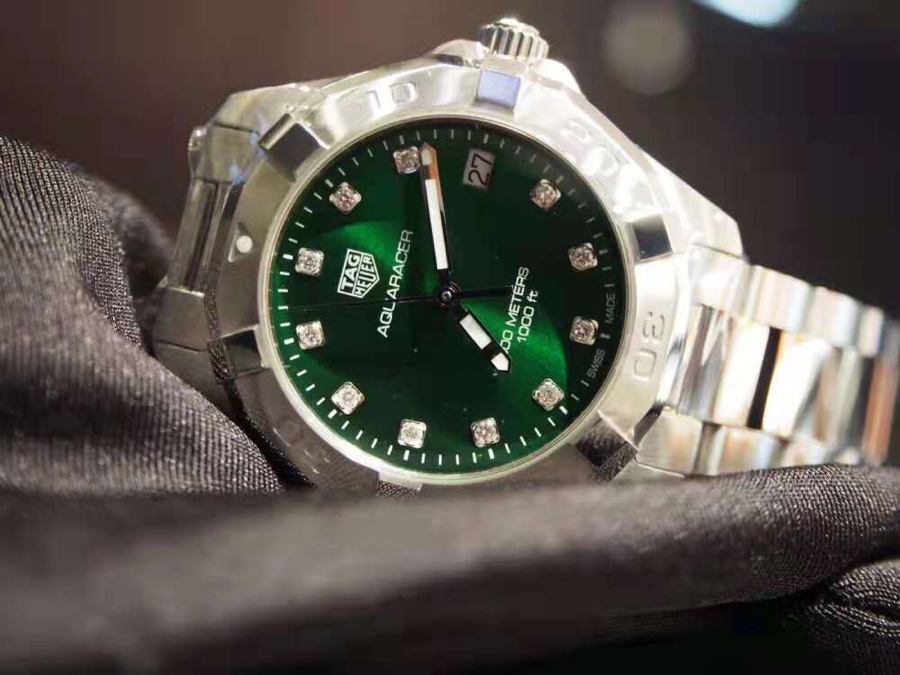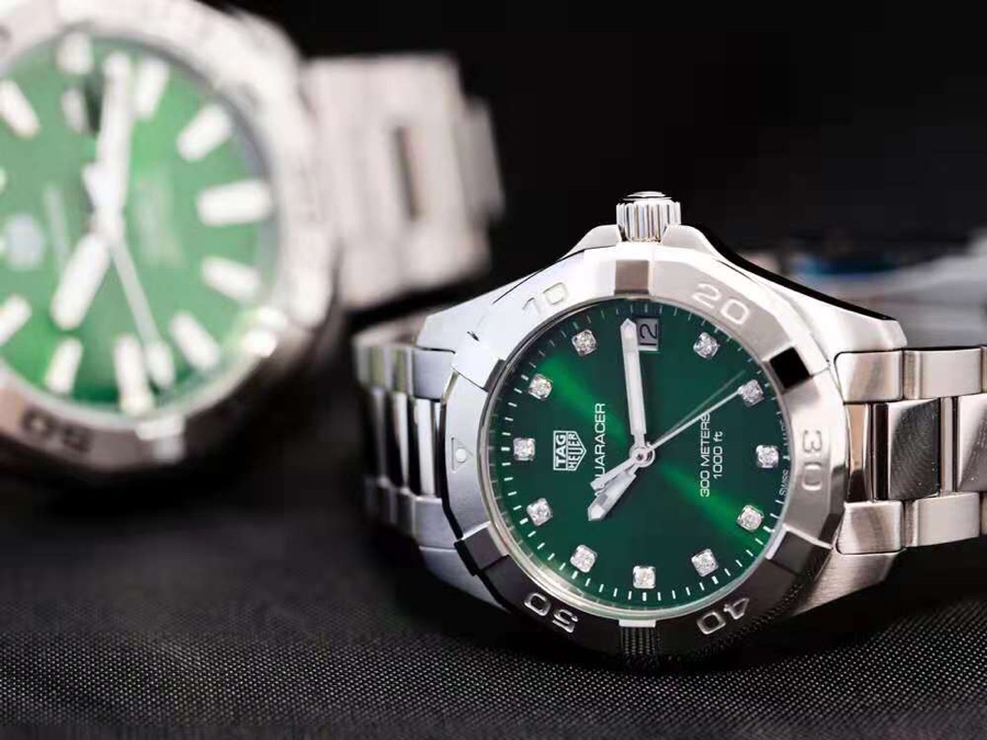 This Best Swiss Replica TAG Heuer Aquaracer Women’s Watch (WBD1316.BA0740) is a AAAA+ Super Clone with a 32mm stainless steel case. The surface is smooth and polished. The bracelet is also stainless steel, strong and comfortable. The watch has a green mother-of-pearl dial with diamond hour markers. There is a second hand and a date display window.