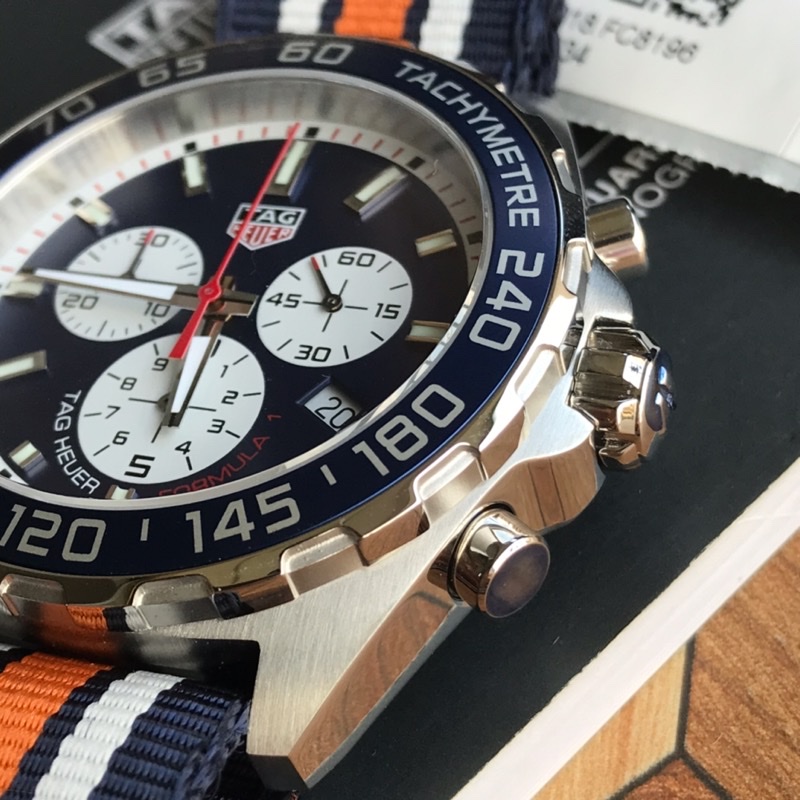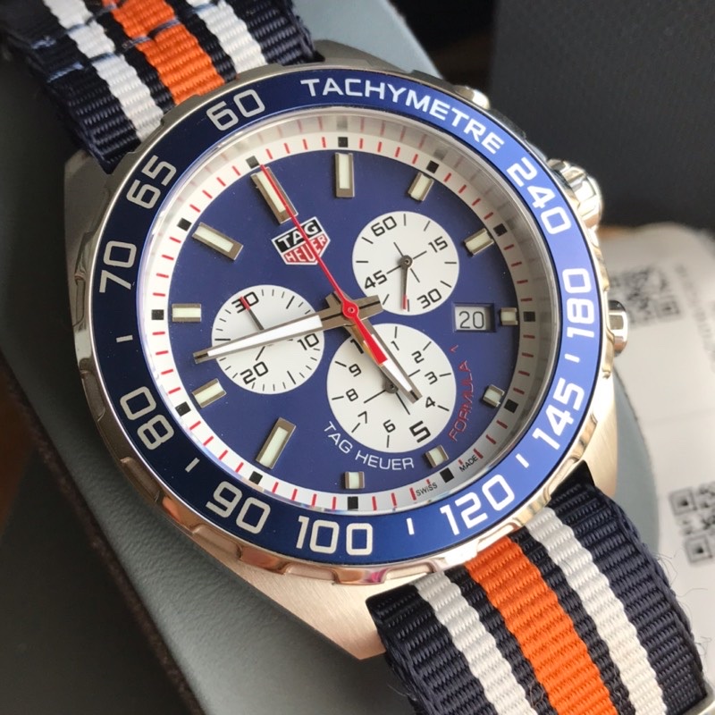 Guarded in scratch-resistant sapphire crystal, the watch has 50 meters' water resistance. It comes attached to a blue NATO fabric strap with a wide orange stripe down the center and two grey stripes up each side—not so typical of car racing inspiration.