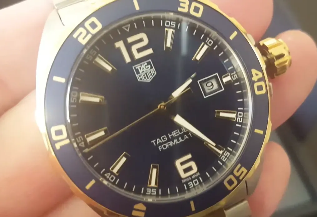 Revamp your look with the Tag Heuer Formula 1 WAZ1120.BB0879 replica watch. It is a high-end watch that alternatingly combines sporty style with classic elegance. It is of 41mm case, and the watch boasts a dark blue face overlaid with luminous gold-tone baton hour markers and large Arabic numerals at 12 and 6 o'clock. A functional date window at 3 o'clock strikes utility and elegance.