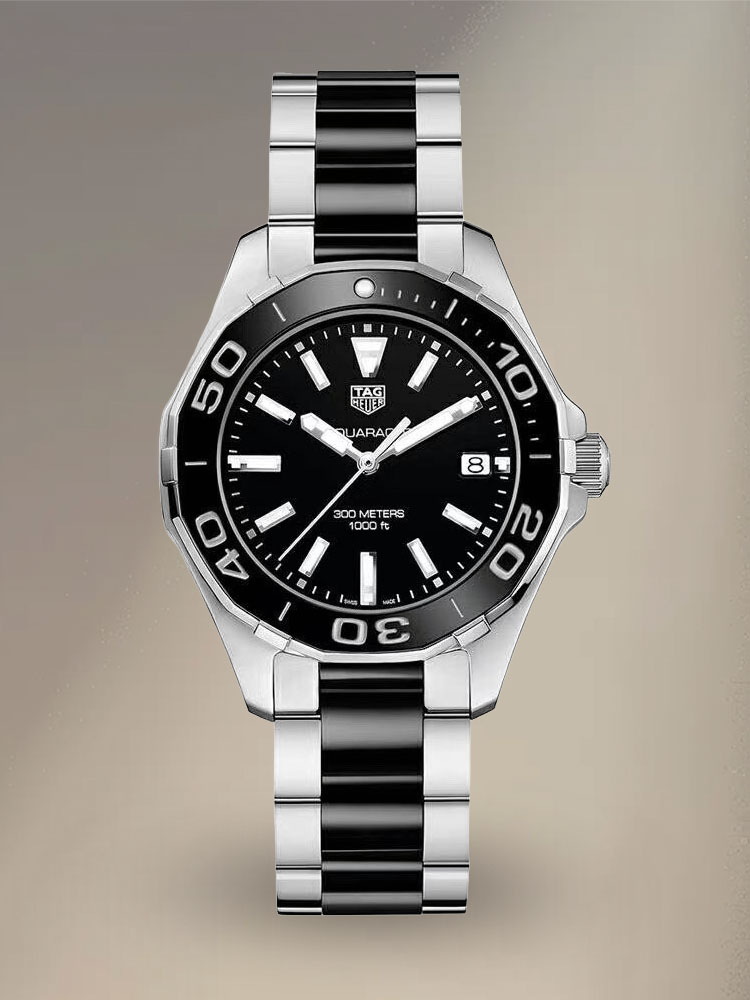 The TAG Heuer Aquaracer WAY131A.BA0913 Swiss ladies’ watch combines fashion with durability for an outstanding product. The watch features a 35mm measurement and showcases a black dial against a polished stainless steel body which includes black ceramic elements creating a luxurious contrast. High-gloss black ceramic central links work together with stainless steel construction to create a bracelet that provides durable strength and comfortable wearing. The timepiece merges Swiss accuracy with water resistance of 100 meters for female customers who value classic sporty sophistication.