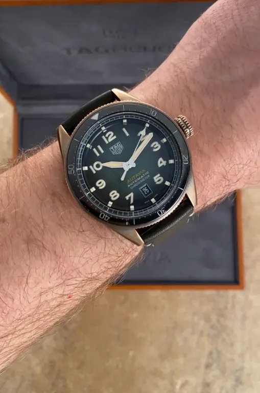 Introducing the TAG Heuer Autavia 2020 Replica that embodies exciting retro style with modern craftsmanship. Featuring a 42mm bronze case with a smoked brown elegant dial to pay homage to the spirit of adventure and sport, model WBE5190.FC8268 is equipped with a Swiss-made movement caliber 2836 offering a 38-hour power reserve. Vintage touches are seen in this design, while its strength and modern sheen are assured with up-to-date materials like a titanium caseback and brown ceramic bezel. Combined with a black strap to finish, the men's watch isn't just a keeper of time but also makes a fashion statement. Scratch-resistant sapphire crystal with a rating of 50 meters water resistance—just perfect for daily wear.