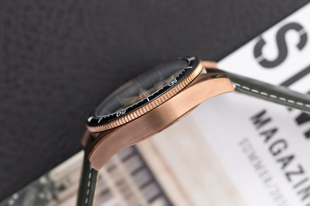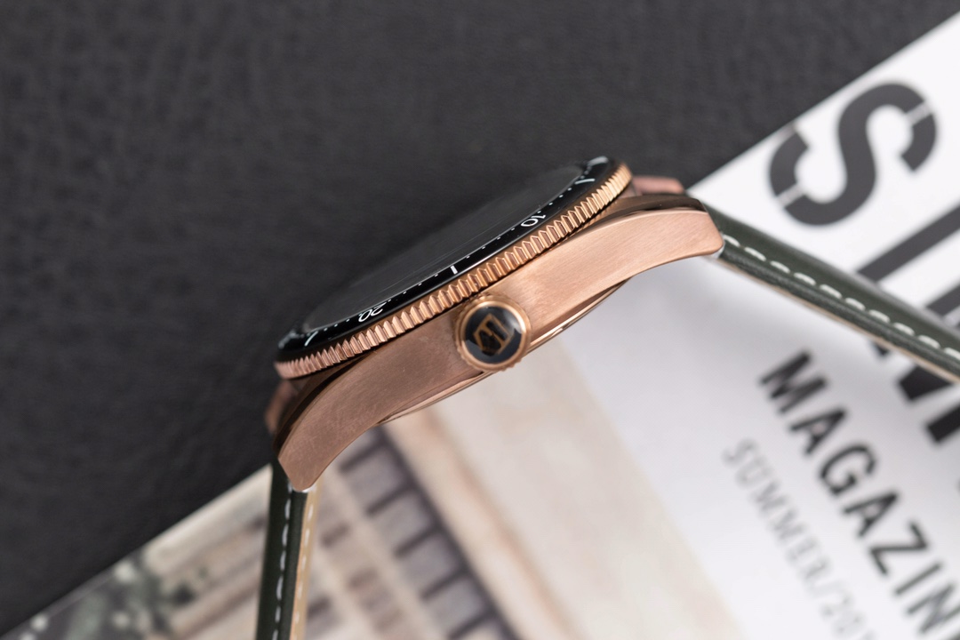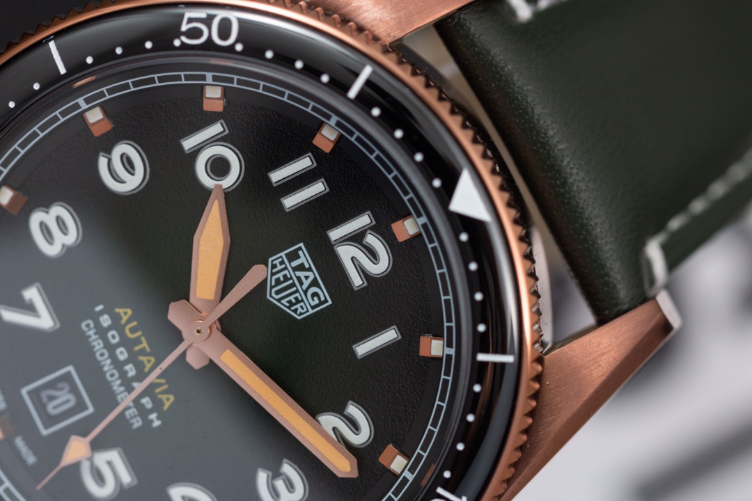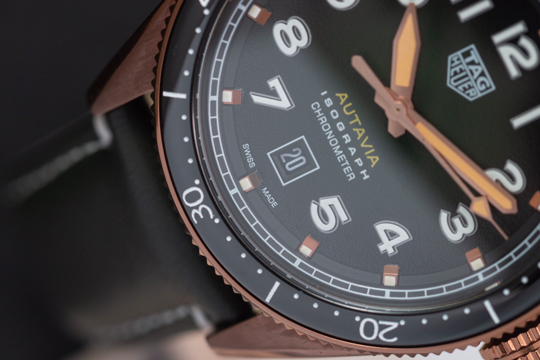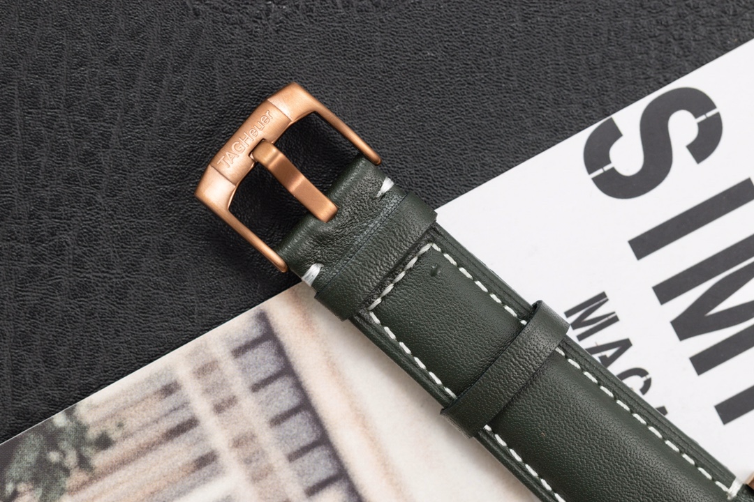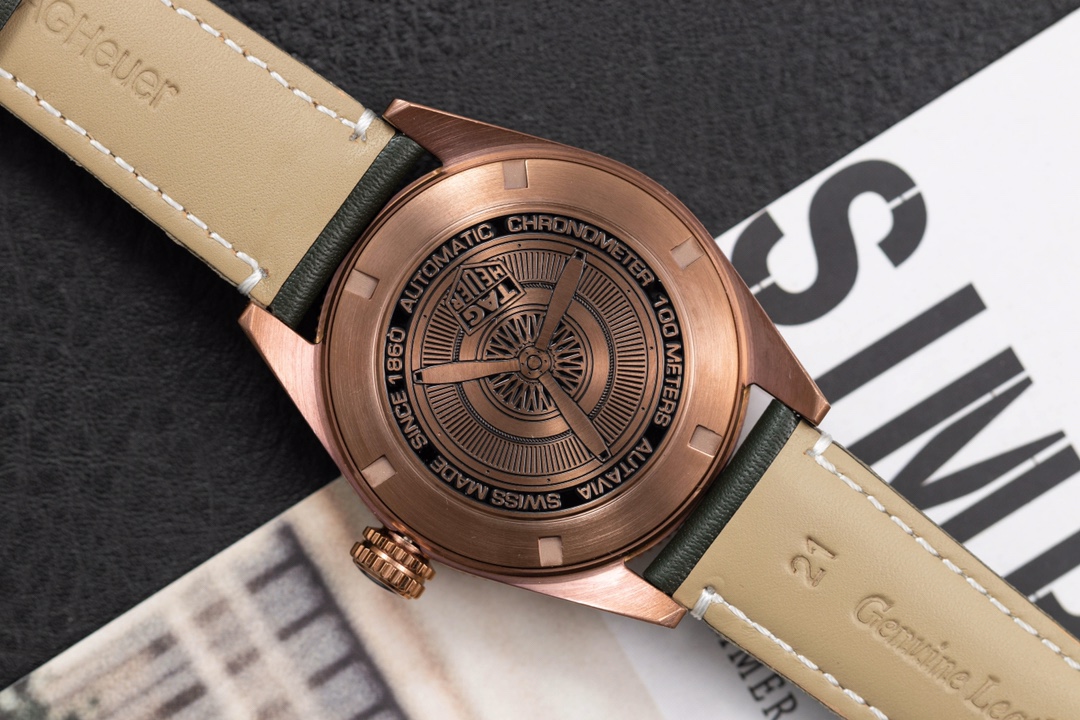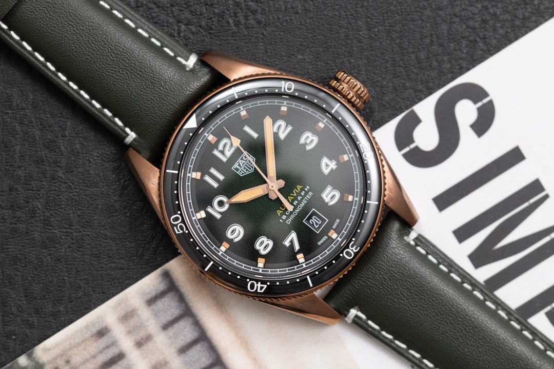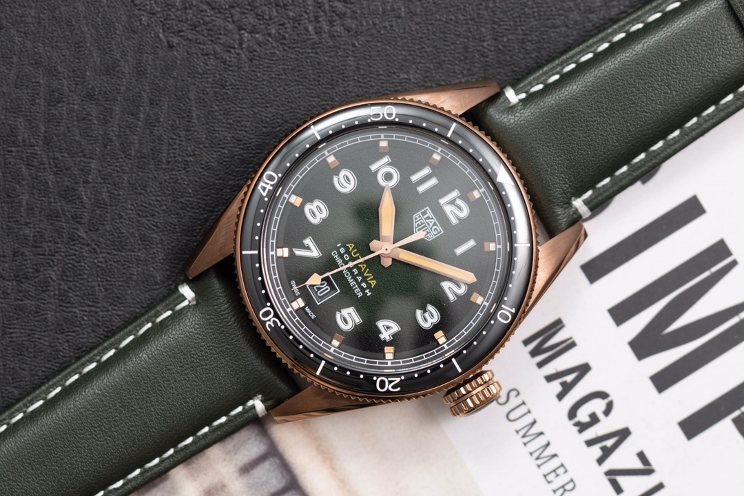TAG Heuer Autavia KKF 2020 Replica WBE5190.FC8268: in honor of the adventurous spirit, combining elements of the past with a modern design. The new model is inspired by the original and has a retro aesthetic with contemporary design language. Matching the 42mm bronze case is a smoky green dial, bringing a sense of nostalgia with a modern twist. The watch has a customized Swiss-made 2836 movement with a 38-hour power reserve. The retro design is elaborated with up-to-date materials, including titanium on the rear of the case and brown ceramics on the bi-directional rotating bezel. This timepiece represents a unique mixture of heritage and innovation, be it for collectors or simply watch enthusiasts.