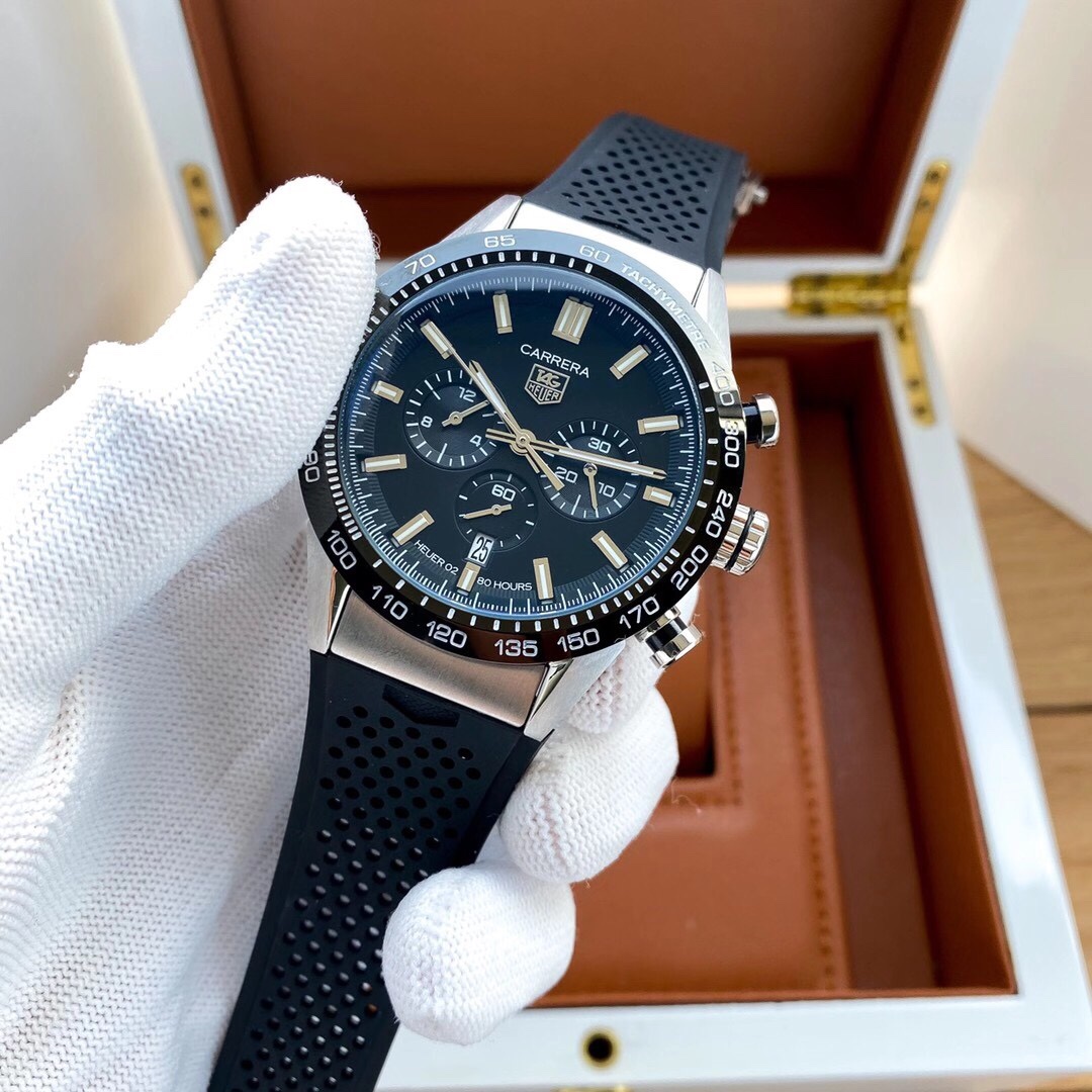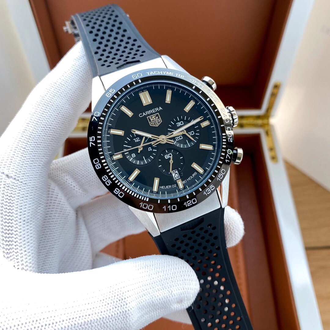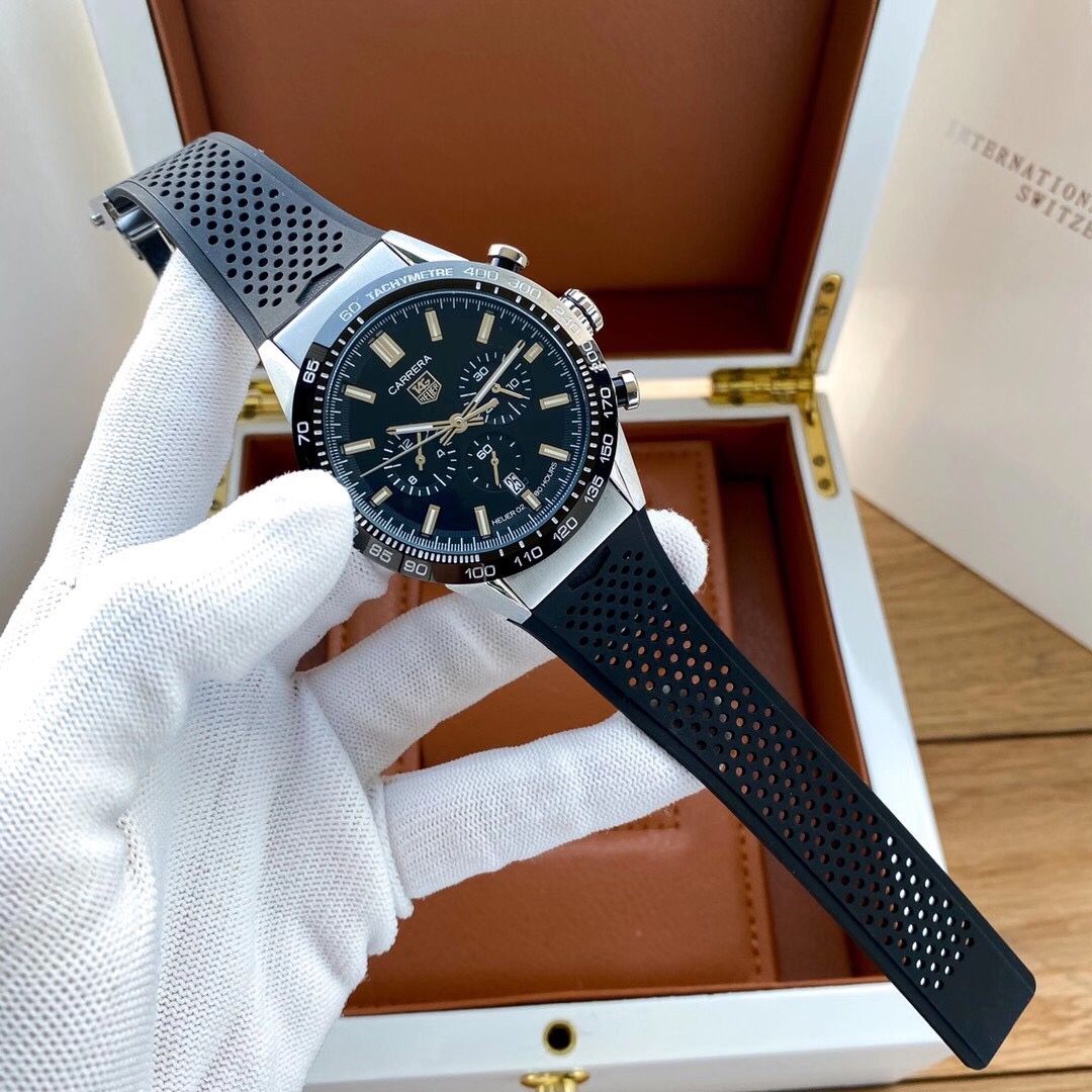The TAG Heuer Carrera CBN2A5A.FC6481 replica is a highly impressive sports chronograph watch whose design is heavily influenced by the racing legacy of the Carrera collection. This watch combines bold motorsport style with modern elegance. It is a great watch to wear on a daily basis. Its case is made of 41mm stainless steel material. This is similar to the original watch. The watch case is sandblasted to give it a sporty and modern look. The watch bezel is made of a black ceramic tachymeter. This allows the wearer to measure speed. The black face features a trio of chronograph dials. This gives the watch a balanced look.