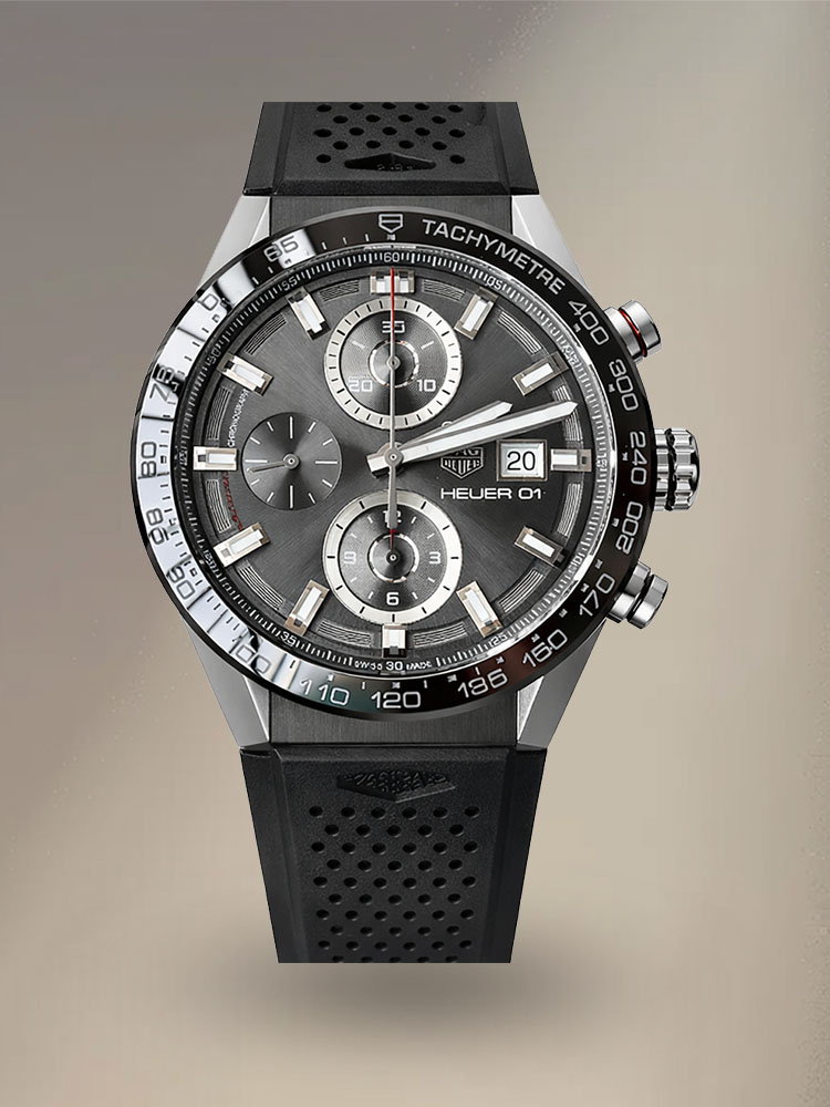 This very reliable watch features a robust 904L steel case, a scratch-resistant black polished ceramic tachymeter bezel, perfectly combining racing DNA and luxury for the modern era. The watch features a very reliable Swiss automatic chronograph movement, a scratch-resistant sapphire crystal lens, a comfortable black perforated rubber strap, and 50m water resistance.
