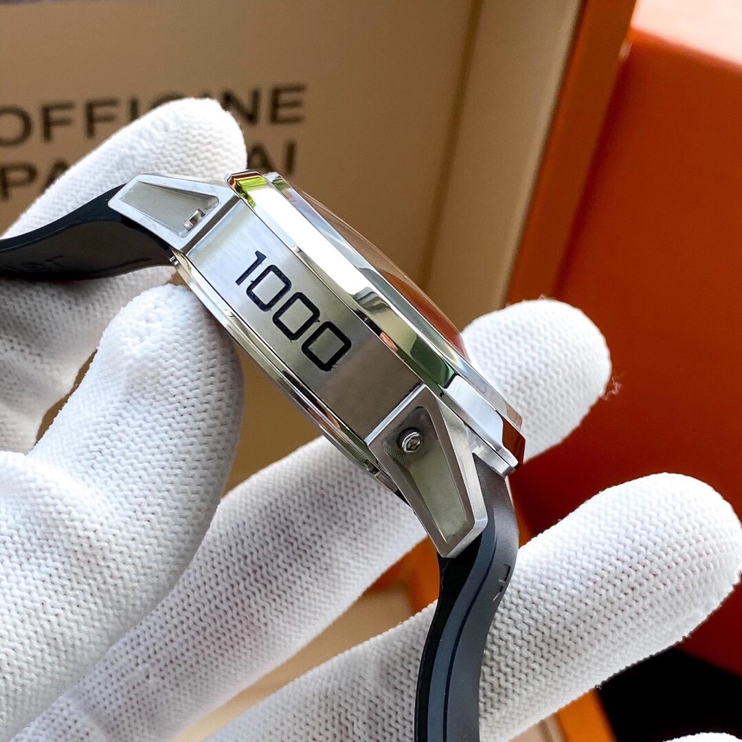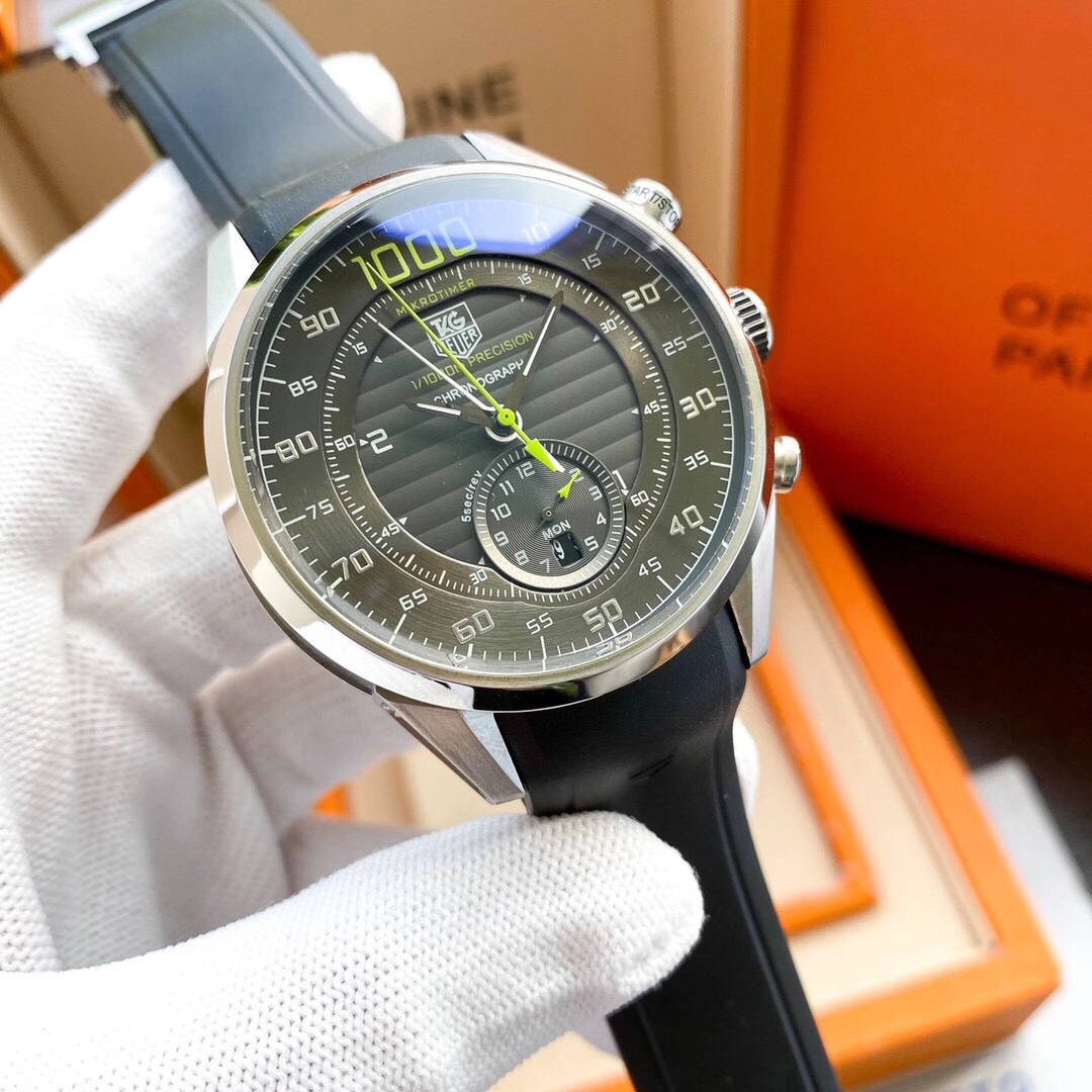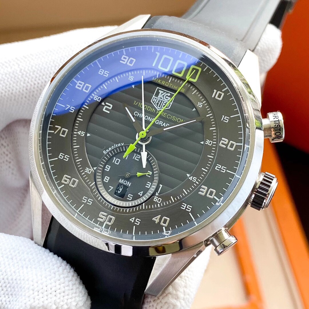 The TAG Heuer Carrera Mikrotimer Flying 1000 CAR5A10.FT6034, the innovative icon of precise timing, now comes in an impressive replica. This 45mm powerhouse comes in an eye-catching black dial with concentric guilloché decoration, together with the bold 1000 emblem at 12 o'clock, which symbolizes the iconic 1/1000th of a second chronograph capability, the first mechanical wrist chronograph in the world to achieve this exceptional degree of precision.