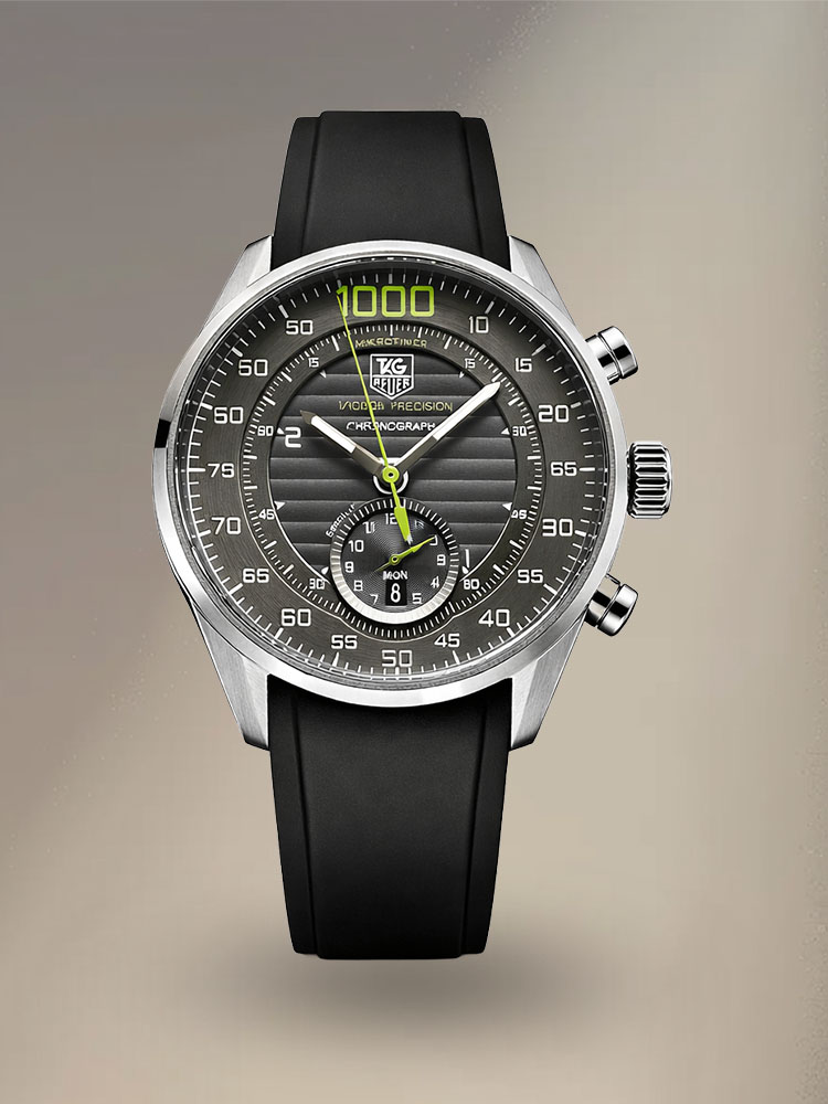 This epitome of racing drama features the outer dial indicating 1000 seconds, the inner dial indicating 5 seconds, the 5 seconds counter at 6 o'clock, the polished black baton hands with lume, and the vibrant yellow 1000 seconds chronograph hand flying around the dial at breathtaking speed. This TAG Heuer timepiece, made of stainless steel, comes with a sporty black rubber strap for comfort and security.