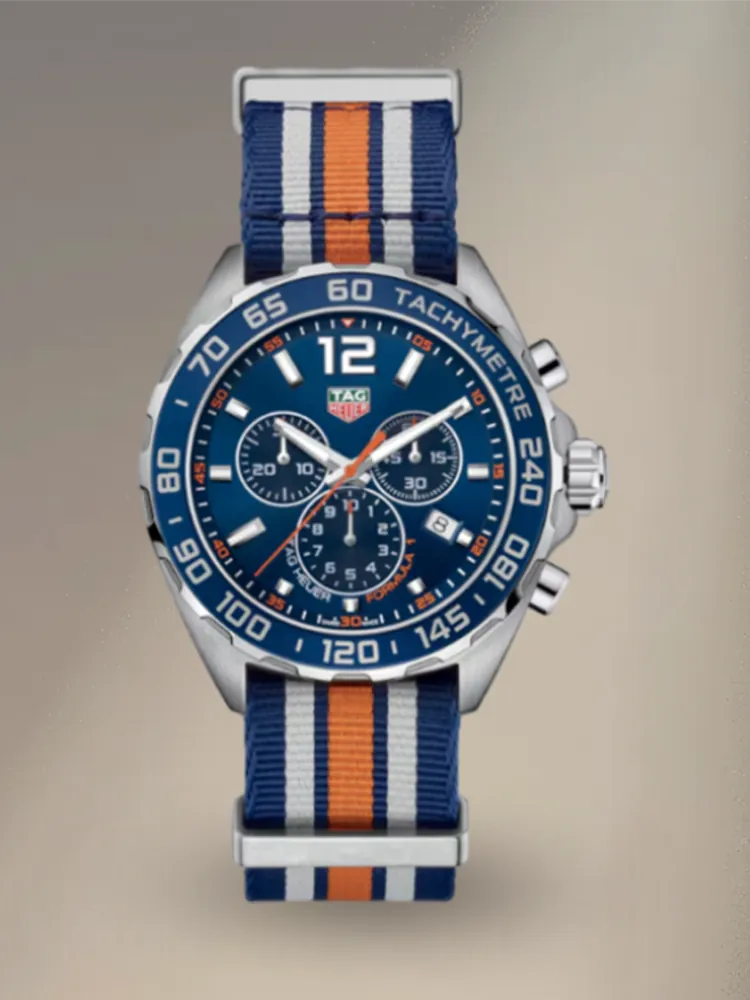 Sporty, versatile, and inspired by the world of motor racing, this TAG Heuer Formula 1 chronograph delivers precision performance with bold, contemporary style. Featuring a striking blue dial, tachymeter bezel, and a dynamic NATO strap with racing stripes, it’s built for those who live life in motion.