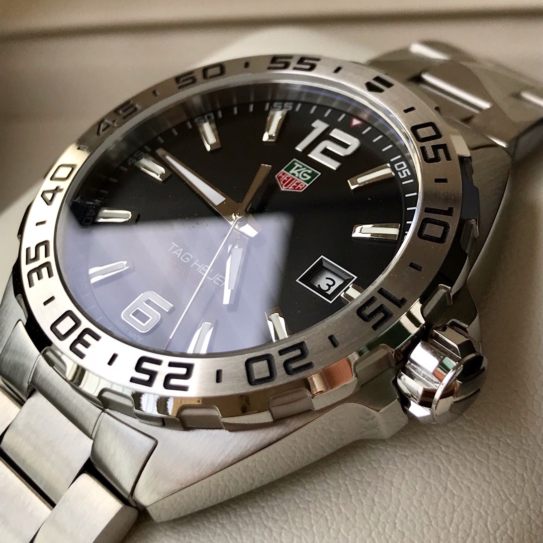 The black opalin dial really pops with super-bright lume on the hands and markers—seriously, the glow is strong enough that you can read it easily even in pitch dark. You get the classic TAG shield logo in white, red, and green, plus a clean date window at 3 o’clock and bigger Arabic numbers at 12 and 6 so everything’s quick to read. The unidirectional bezel has a full 60-minute scale, just like the real deal, perfect for timing laps or timing anything else.