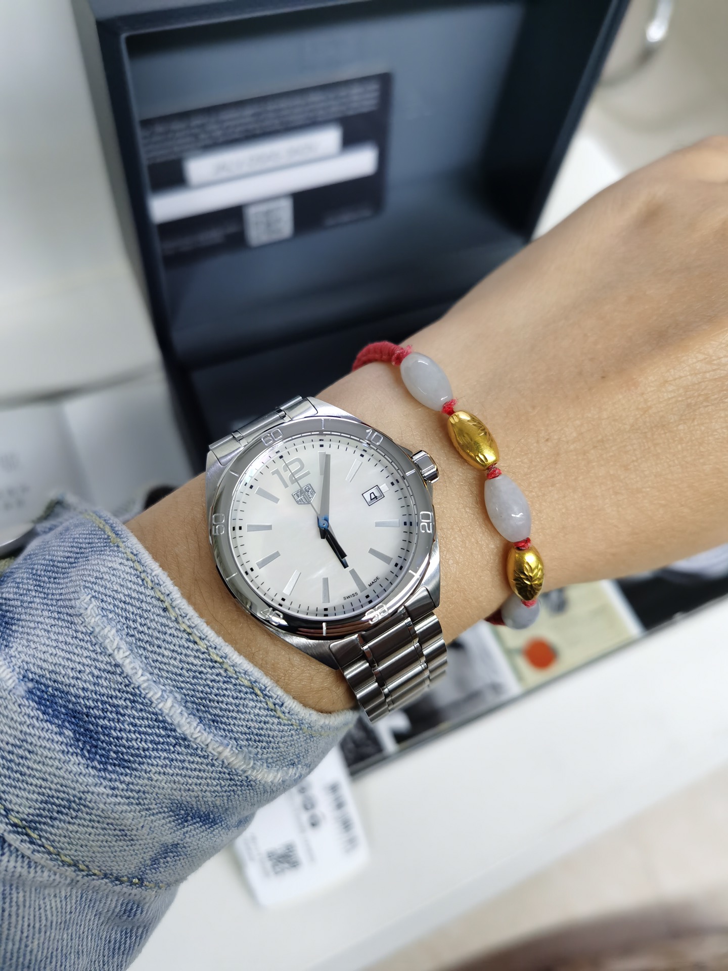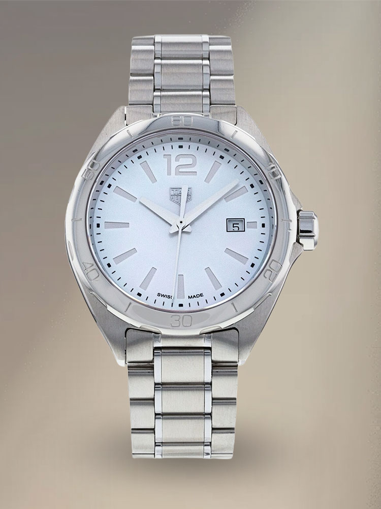 This stunning replica TAG Heuer Formula 1 has a white MOP dial that shimmers with iridescence in the colors of the rainbow, with silver-toned hands, indices, and an Arabic numeral 12, along with a date window at the 3 o'clock position, all guaranteed to be precise and hassle-free with Swiss quartz movement.