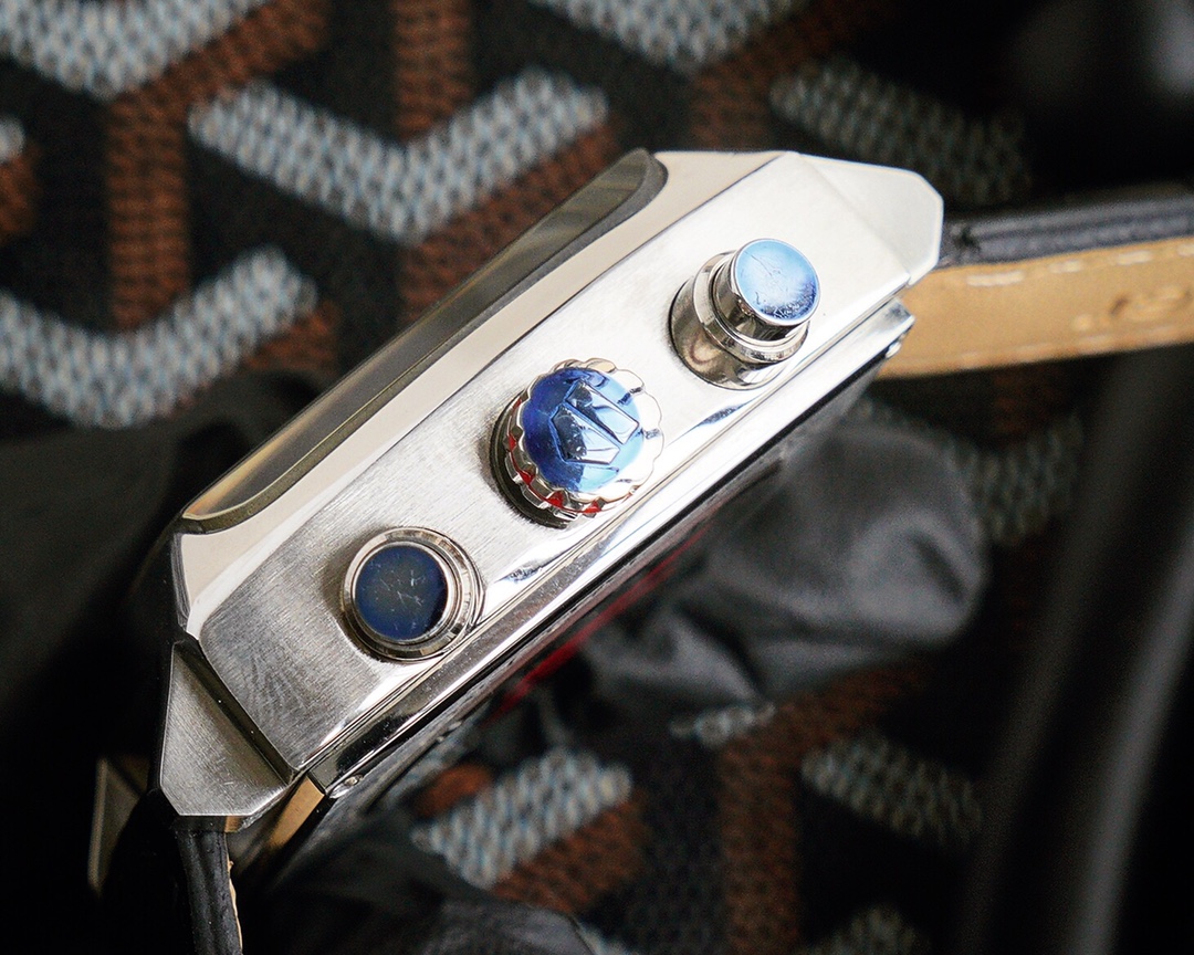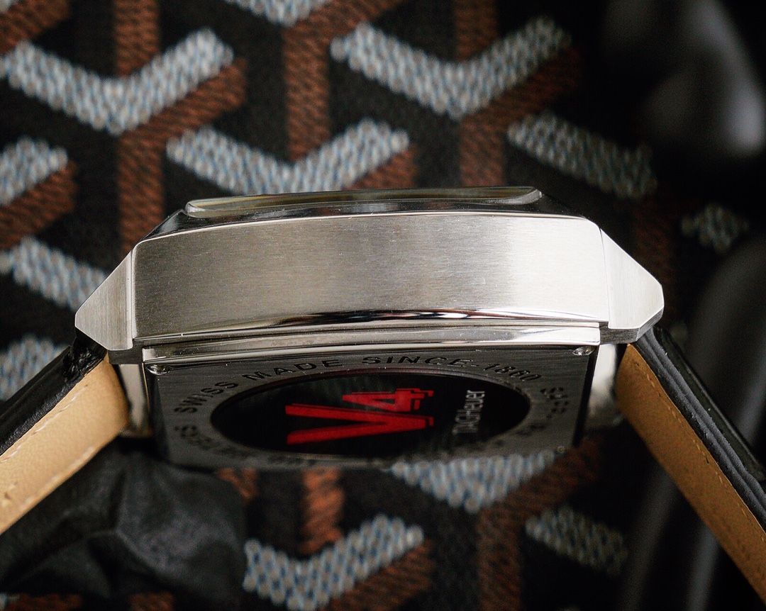 Meet the TAG Heuer Monaco 590 Replica – a dashing and gorgeous men's watch that combines everlasting beauty with modern precision. The 39mm x 39mm stainless steel case with magnificently engraved patterns is beautiful, and the stark black dial offers enough contrast to easily tell the time markings and the hands apart. Powered by the VK quartz movement, this watch is highly accurate and dependable with no hassle of winding or battery replacement. Fitted with a sapphire crystal to offer durability and 50-meter water resistance, the Monaco 590 is the perfect watch to wear on a daily basis. The black leather strap completes the overall elegance of this Swiss-made timepiece, thus the perfect accessory for any fashion-forward gentleman.